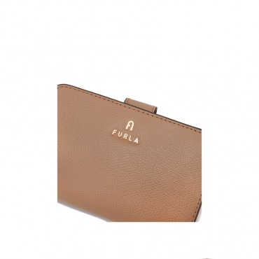 Il portafoglio Furla Camelia si caratterizza per il suo design minimale con apertura a libro. Realizzato in pregiata pelle liscia definita da angoli smussati e linee sinuose, è un accessorio essenziale da custodire in ogni borsa. Il formato compatto è perfettamente studiato per organizzare al meglio banconote, carte e documenti. - Dieci scomparti interni per carte di credito - Scomparto interno per banconote - Quattro tasche interne laterali - Tasca interna portamonete con chiusura a zip - Chiusura a patta con bottone a pressione - Mini logo Furla e Arco punzonati sul davanti