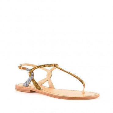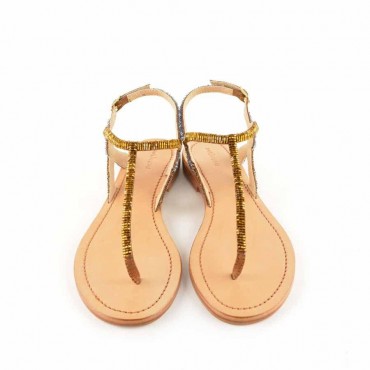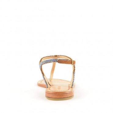 Modello sandalo infradito donna basso Infrabijoux flat Cuts & Beads con ricamo di perline su perline di diversi colori fatto a mano colore celeste e bronzo. Su fondo in cuoio con tacco 1,5 cm. Il tutto per un particolare effetto luminoso, da utilizzarsi nel quotidiano ma anche nelle serate d'estte per un look radical chic sotto gonnelloni o abitini estivi.