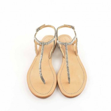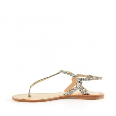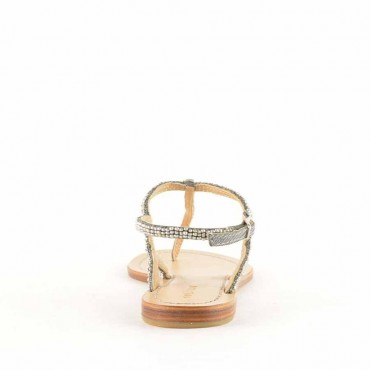 Modello sandalo infradito donna basso Infrabijoux flat Cuts & Beads con ricamo di perline su perline di diversi colori fatto a mano colore argento (silver). Su fondo in cuoio con tacco 1,5 cm. Il tutto per un particolare effetto luminoso, da utilizzarsi nel quotidiano ma anche nelle serate d'estte per un look radical chic sotto gonnelloni o abitini estivi.