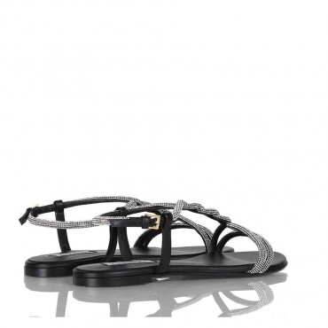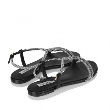 Modello sandalo da donna in morbida nappa colore nero impreziosito da cinturino di strass. Fondo cuoio. Tacco 1 cm