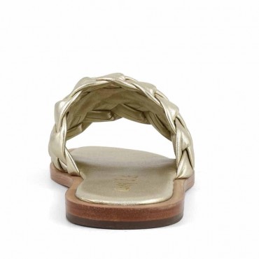 Modello sandali donna slipper in pelle intrecciato colore tinta unita gold. Semplicemente impeccabili ed eleganti sono le slipper con tomaia monofascia di pelle intrecciata e suola ultra flat di cuoio. Ideali da sfoggiare nelle località balneari più trendy del momento, sono super cool se indossate con abiti pareo di seta leggera con costume coordinato, un po’ stile Grace Kelly ma, daranno il meglio di sé anche in città, se abbinate a un tailleur pantaloni in tinta unita dal taglio sartoriale.