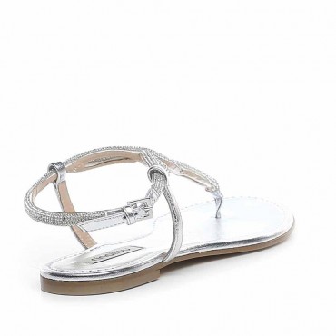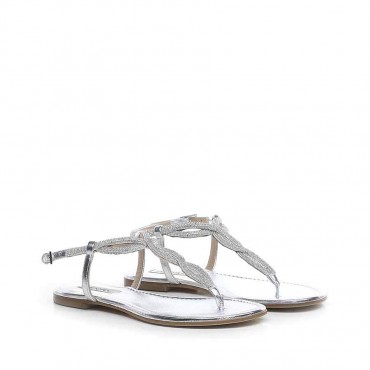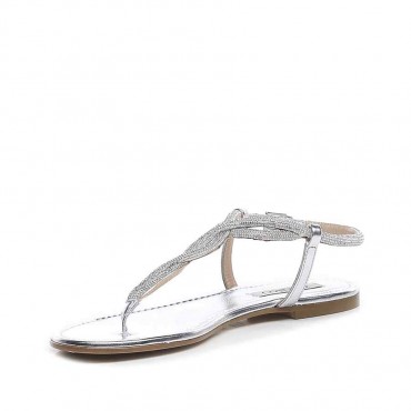 Modello sandalo infradito da donna su tacco basso in morbida nappa colore metallizzato argento , con particolare ricamo in micro swarovski sul collo partendo dall'infradito a finire in un incrocio sulla caviglia chiusa da regolo metallico. Questo sandalo arricchito da cristalli darà un tocco glamour a ogni look. Il tacco di 1 cm è perfetto per essere indossato anche con un abito lungo durante una serata importante dato l'effetto luminoso dato dal dettaglio in swarovski.