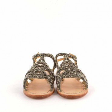 Modello sandalo donna basso flat Cuts & Beads con ricamo di perline su perline di diversi colori fatto a mano colore canna fucile. Sandalo con fascette incrociate e ricamo di cuts fatto a mano. Su fondo in cuoio con tacco 1,5 cm. Il tutto per un particolare effetto luminoso, da utilizzarsi nel quotidiano ma anche nelle serate d'estte per un look radical chic sotto gonnelloni o abitini estivi.