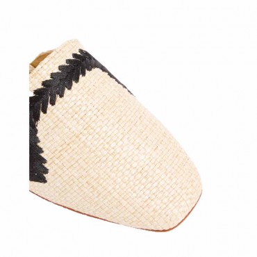 CARATTERISTICHE COLORE: NATURALE/NERO COMPOSIZIONE INTERNA: 100% PELLE DI PECORA COMPOSIZIONE ESTERNA: 80% NYLON, 20% COTONE MATERIALE SUOLA: CUEROLITE