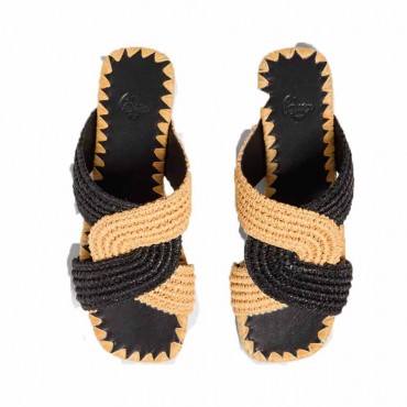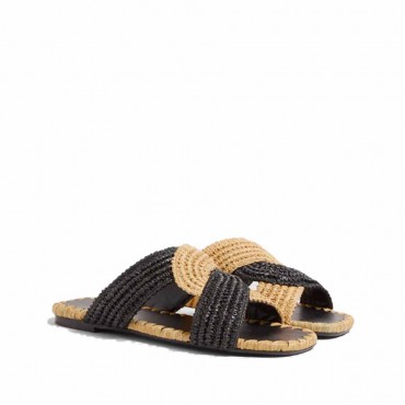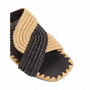 Modello sandalo ciabatta flat espadrillas Prado in rafia colore naturale nero. Prado ha un design unico in rafia che valorizzerà i tuoi outfit quotidiani. Realizzati a mano con una punta aperta quadra ed una suola piatta.