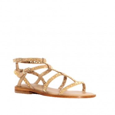 Sandalo Pandora in pelle beige con borchie, cinturino regolabile alla caviglia con fibbia, suola in cuoio con logo.