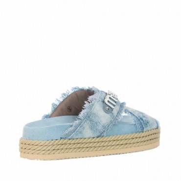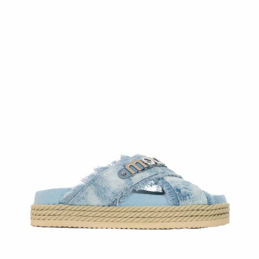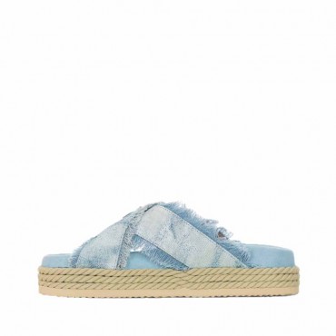 Modello sandalo da donna scalzato. Novità per l'estate 2025: il criss-cross sandal denim è la quintessenza dello chic estivo. Realizzato a mano in morbido cotone, con le cuciture all'uncinetto distintive della eskimo, questo capo è dotato di una resistente e leggerissima suola in EVA e bordi in corda, ed è rifinito con un plantare imbottito in microsuede per un comfort ancora maggiore. Altezza 2,5cm.