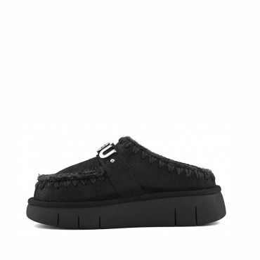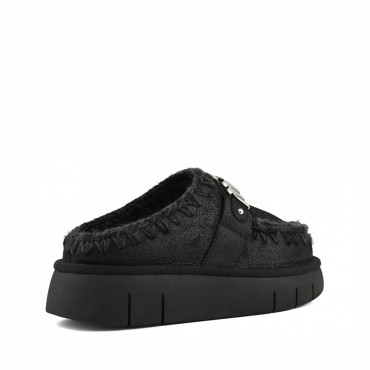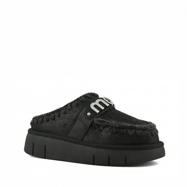 Modello lo scalzato donna bounce clog con logo metallizzato è sapientemente realizzato a mano in vera pelle di montone colore nero effetto Cracked Black (CBKG) double face e dettagli all'uncinetto, distintivi di mou. Il plantare imbottito in pelle e la suola leggera in EVA & gomma rendono questo modello incredibilmente comodo da indossare.