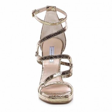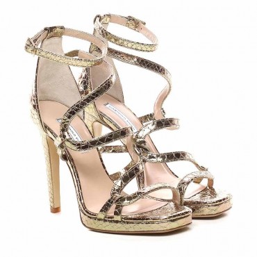 Modello sandalo donna su tacco alto in pelle naturale stampa pitone laminata oro con cinturino caviglia e suola in cuoio. Il particolare effetto sul collo piede dato da fettucce di pelle permettono una calzata piu confortevole ed un elegante e femminile effetto. Trattenuto al piede da cinturino regolabile alla caviglia Tacco 110, platform 20 con battuta 90.