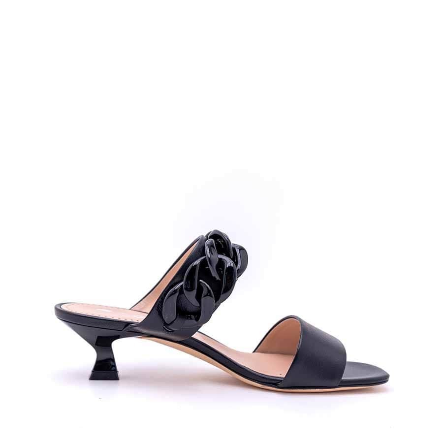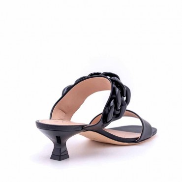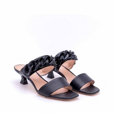 Modello sandalo donna mule in pelle vitello colore nero su tacco 5 cm colore con forma arrocchettata secondo i piu attuali stilemi moda. Forma leggermente quadra. Sul collo decorazione concatena colore nero in plastica ultra light. Fondo cuoio. Must have per ogni donna che vuole essere alla moda. Utilizzabile non solo in situazioni eleganti ma, sdrammatizzato, anche sotto pantaloni e jeans per un femminile effetto a contrasto. Totalmente fatto a mano. Totalmente Made in Italy