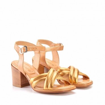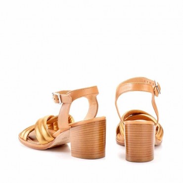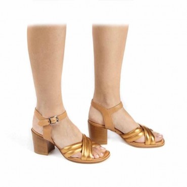 Sandalo in pelle color oro e miele,fodera in pelle beige, fondo in cuoio con antiscivolo. Tacco 75 mm.