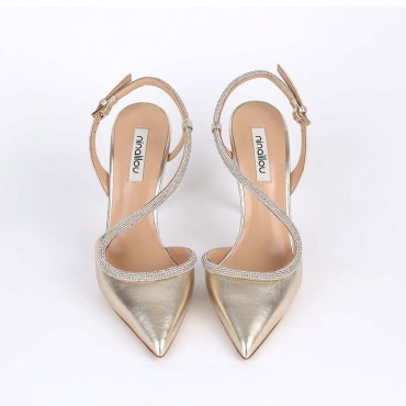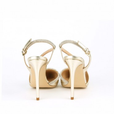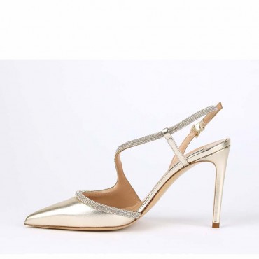 Modello sandalo da donna chanel in pelle colore platino effetto metallizzato, con particolare fascia sul collo con richiamo alle scarpe da tango in swarovski a definire una linea femminile che esalta il piede. Il tacco a stiletto alto di 9,5 cm è perfetto per essere indossato con un abito lungo durante una serata importante!