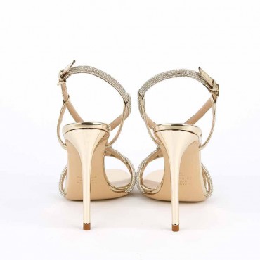 Modello sandalo da donna in pelle colore platino effetto specchio, ricamato con strass. Linee essenziali e raffinate sono volte a valorizzare la silhouette femminile di tutte le donne. Slanciato dal tacco, questo sandalo gioiello assicura un tocco elegante e sofisticato a qualsiasi look.