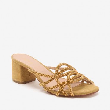 Modello sandalo donna scalzato con ricamo di perlina su perlina fatto a mano colore oro. Su tacco largo 5 cm . Il tutto per un particolare effetto luminoso, da utlizzarsi nel quotidiano ma anche nelle serate d'estate per un look radical chic sotto gonnelloni o abitini estivi