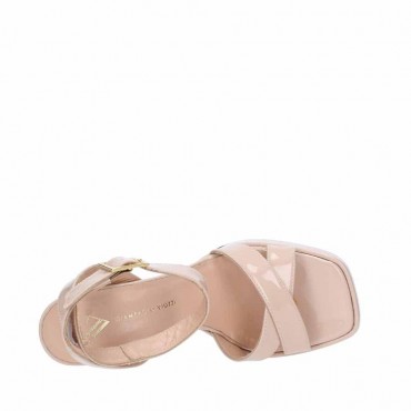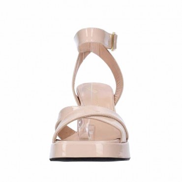 Modello sandalo donna su tacco alto in pelle vitello effetto vernice colore nude. Sandali su tacco quadro 10 cm e plateau 2.5 cm per un maggiore confort. Chiusura con cinturino alla caviglia regolabile . Fascette incrociate sulla pianta del piede.
