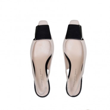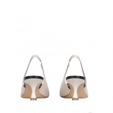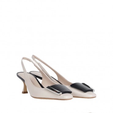 Arienne è una slingback bicolore in pelle, caratterizzata da un elegante contrasto tra il color butter e il nero. Con un tacco di 50 mm, offre il perfetto mix tra comfort e stile. L’accessorio rivestito in punta, a contrasto con la tomaia, è impreziosito da un dettaglio in metallo che aggiunge un tocco moderno e raffinato. Ideale per chi cerca un look chic e versatile, Arienne è perfetta per completare outfit da giorno o serali con un’eleganza distintiva e sofisticata.