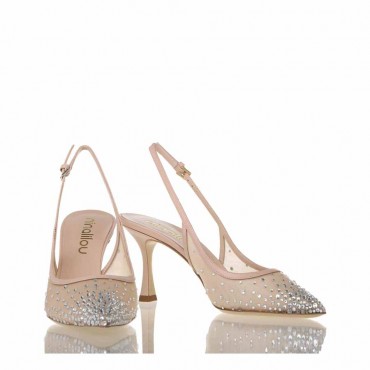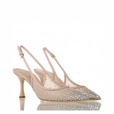 Modello sandalo slingback in morbida nappa con punta in rete e applicazione di strass. Suola in cuoio. Tacco 7,5 cm.Questa decolleté unisce raffinatezza e modernità, trasformando ogni dettaglio in pura magia. Realizzata con materiali pregiati e impreziosita da strass scintillanti, è pensata per accompagnarti nel giorno in cui ogni occhiata sarà per te. Un design che celebra la tua unicità, una scarpa che non è solo per il tuo “Sì,” ma per ogni occasione in cui vuoi sentirti straordinaria.