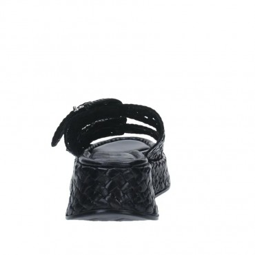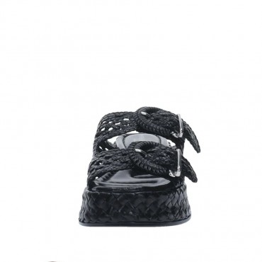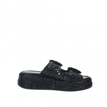 Ciabatta in pelle intrecciata, dettagli traforati, fasce regolabili tramite fibbia metallica, fodera e sottopiede in pelle, zeppa rivestita in pelle intrecciata 4 cm, suola in gomma, made in Spain.