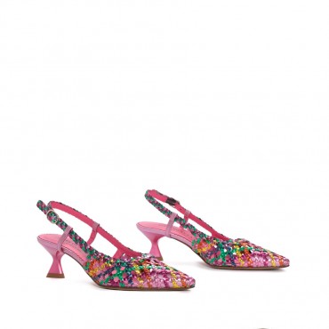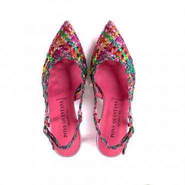 Decollete slingback da donna firmati Pons Quintana realizzati in pelle intrecciata variante multicolor fucsia. Tacco alto in tono. Le decollete slingback di Pons Quintana sono un capolavoro di eleganza e comfort, perfette per la donna che non vuole rinunciare a stile e qualità. Realizzate con meticolosa attenzione al dettaglio in Spagna, queste calzature si distinguono per la loro pelle intrecciata, simbolo dell'alta artigianalità del marchio.