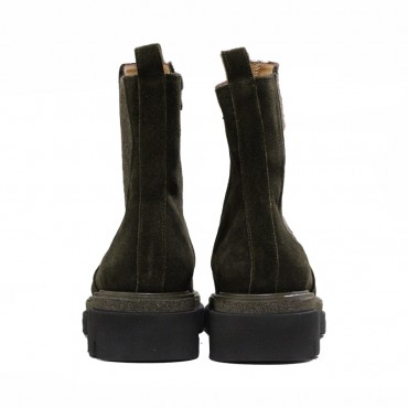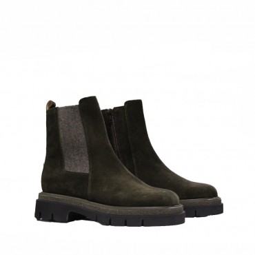 Tomaia in camoscio foresta ed elastico taupe. Suola in gomma e fodera in pelle mezza zip laterale.
