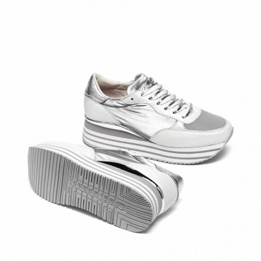 Modello sneakers running allacciata in pelle colore bianco e tessuto ai fianchi ed in punta in colore argento. Allacciata a 6 fori con doppio laccio bianco e argento. Particolari al tallone ad alla punta in differenti pelli in grigio effetto mat. Fondo in gomma running con striscie a contrasto di colore
