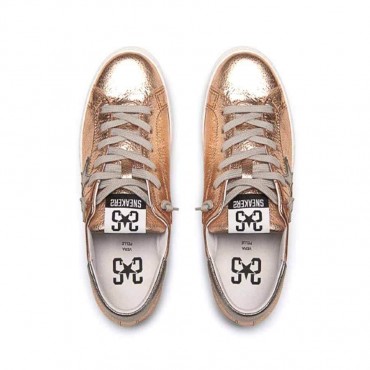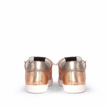 Modello scarpa da donna sneakers converse in combinazione di pelle effetto laminato colore rame e spoiler laminato colore piombo. Allacciata a 6 fori e passanti con laccio in colore in contrasto. Su fondo gomma extra light vulcanizzato cucito.