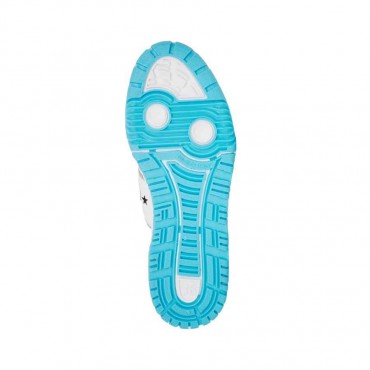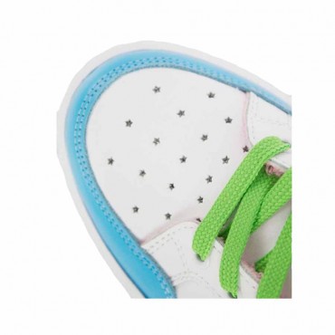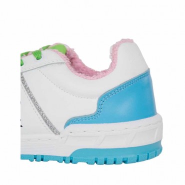 Modello sneakers donna in pelle bianca con particolari celeste (blue acqurius) a contrasto. Interno in spugna a contrasto di colore rosa. Banda "Logomania" ai lati iconico del Brand. Suola in gomma.