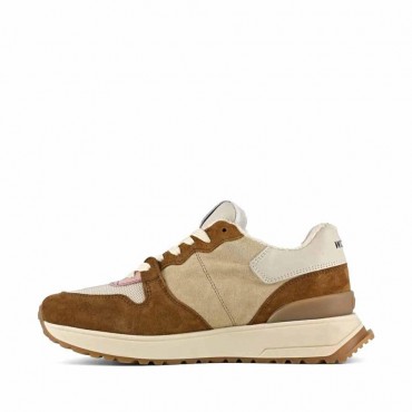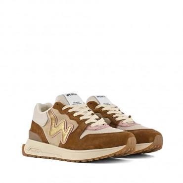 Modello sneakers donna in camoscio e tessuto. Versatile, semplice e colorata, la sneaker Wise è un modello cardine della collezione Womsh. La tomaia di questa sneaker è realizzata in pelle al 60% e in poliestere riciclato al 40%. La linea Wise è stata disegnata ed ideata in una serie di colori a contrasto camoscio tabacco e tessuto beige con riporti e particolari oro e rosa che daranno carattere ai tuoi outfit.