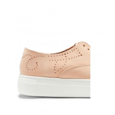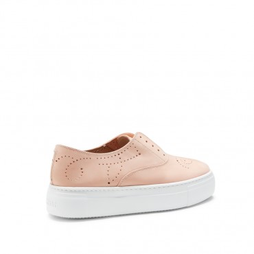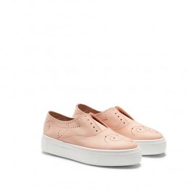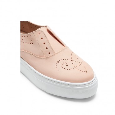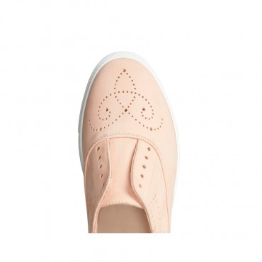 Iconica sneakers di Fratelli Rossetti, realizzata in morbido nabuk di colore pesca, Cinque fori con lacci di cotone cerato in nuance. La scarpa può essere indossata con o senza lacci. Soletta interna in pelle removibile e fondo a cassetta in gomma antiscivolo. Suola a cassetta in gomma con battistrada personalizzato.