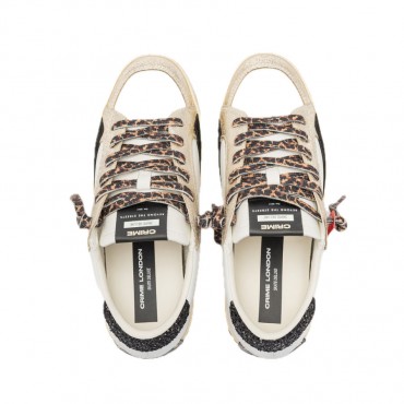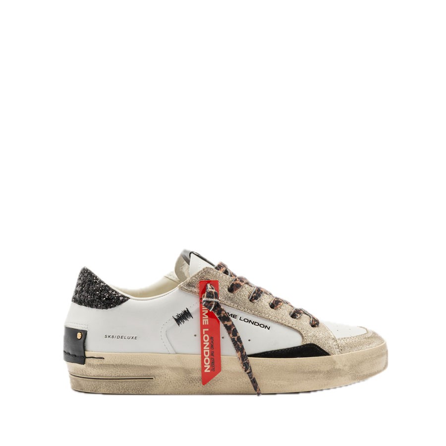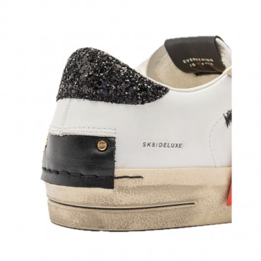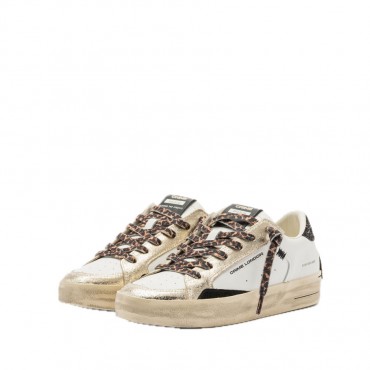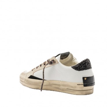 Modello scarpa da donna converse in combinazione di pelle italiana di alta qualità tomaia in pelle bianca, Dettagli in cracklé oro e Talloncino in glitter nera. Linguetta in pelle bianco con label logata in pelle con Unico tag in pvc rosso e Patch in pelle sul retro fissato con micro viti