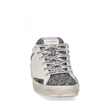 Tomaia in pelle bianca dettagli al alloncino in cavallino animale grigio. Linguetta glitter argento con label logata in pelle e punta in glitter argento. Lacci bianchi logati Fodera in pelle e tessuto Suola in ecopelle fasciata ivory, fondo nero, alta 2.5 - 3.5 cm Effetto vintage