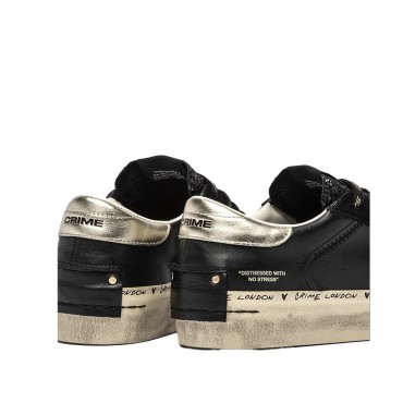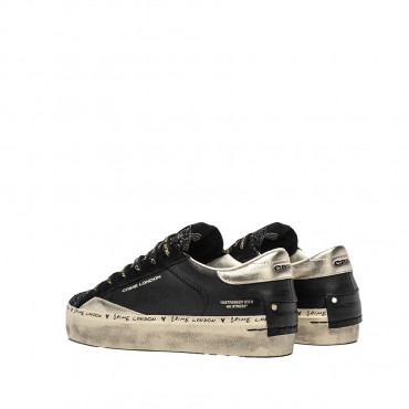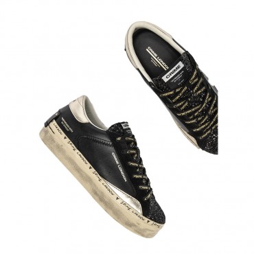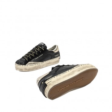 Realizzate in pelle, queste sneakers presentano una palette di colori nera, arricchita da dettagli dorati. La struttura combina comfort e stile, ideale per un look contemporaneo. Il design distintivo è caratterizzato da una suola effetto consumato, conferendo un tocco di originalità. La vestibilità è ottimale, garantendo praticità e un'estetica accattivante. Perfette per completare outfit casual e chic.