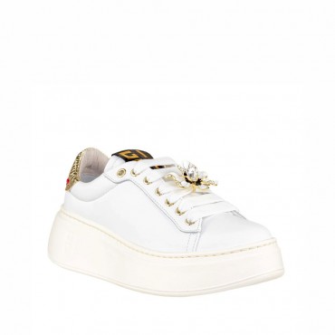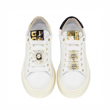 Modello sneakers donna in vitello colore biancocon particolare tallonetta e sotto patta laccio in pelle stampa cocco nero e oro abbinate alternando colori. Al collo accessori fiore ed api in metallo colore oro bianco e nero removibili. Lacci in tinta bianco, fondo ultra leggero, alto, in tinta. Interno pelle Plantare memory, estraibile, lavabile