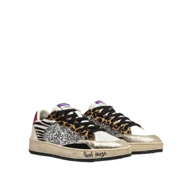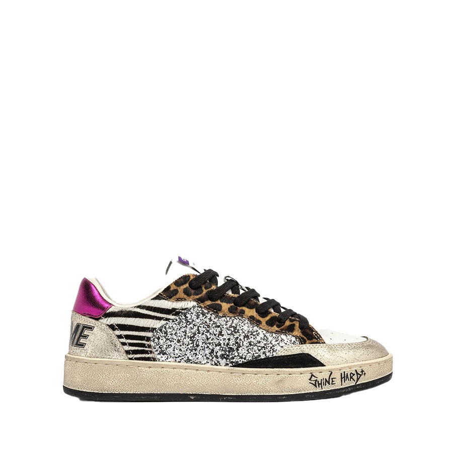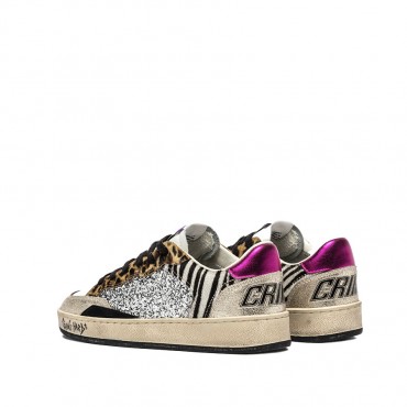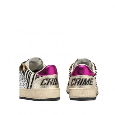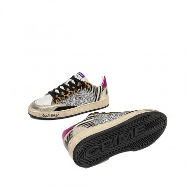 Modello scarpa da donna sneaker realizzata con materiali di alta qualità Made in Italy.Sneaker realizzata con materiali di alta qualità Made in Italy Tomaia in glitter argento, dettagli in cavallino leopardato Talloncino in lamina lampone Tallone in cracklé oro con logo CRIME Inserto in cavallino zebrato Linguetta in pelle bianco con label logata in tessuto Lacci neri in cotone Fodera in pelle e tessuto Suola in gomma beige, fondo nero, alta 2.5 - 3 cm