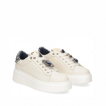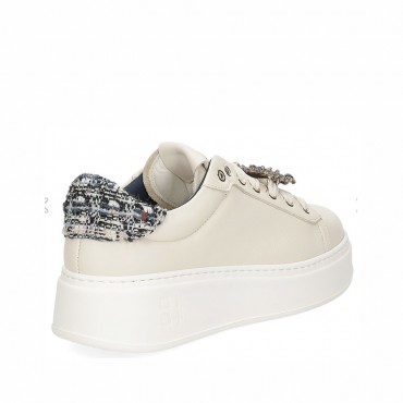 Modello sneakers donna in vitello colore PANNA con particolare tallonetta tessuto bouclet base blu. Ai lacci accessori in metallo colore oro e blu removibili. Lacci in tinta panna, fondo ultra leggero, alto, in tinta. Interno pelle Plantare memory, estraibile, lavabile