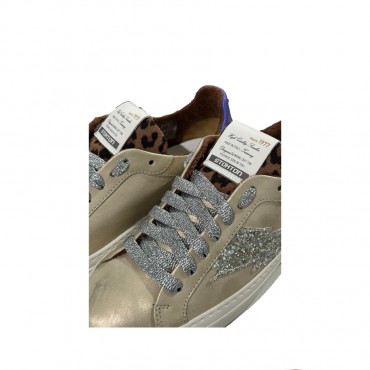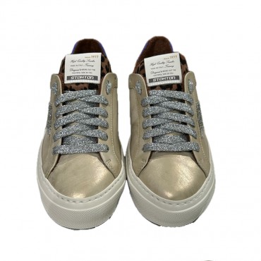 Sneaker POWER BOLT in pelle gold con dettaglio laterale glitter, fodera in tela di cotone e plantare interno rialzato in pelle, suola cucita in gomma, prodotto artigianale realizzato in Toscana con pellami di prima qualità.