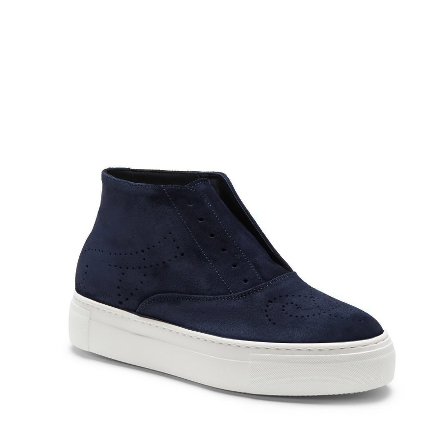 Iconica sneaker Hobo Sport con dettagli di forature interpretata nella versione desert boot. Realizzata in morbida pelle pelle scamosciata con particolare aspetto lucido. Casual e raffinata può essere indossata senza lacci. Soletta interna estraibile e traspirante. La suola a cassetta realizzata in gomma con battistrada personalizzato è alta 55mm.