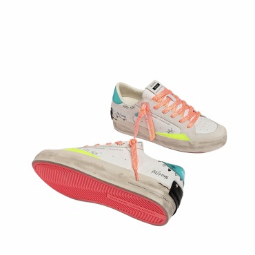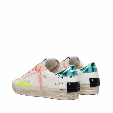 Realizzate  con materiali di alta qualità Made in Italy, presentano una tomaia in pelle bianca arricchita da dettagli in cracklé giallo fluo che creano un contrasto vivace e contemporaneo. Il talloncino in lamina turchese illumina il design, mentre la linguetta in pelle bianca con label logata e la patch in pelle nera sul retro valorizzano l’identità distintiva del brand.
