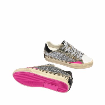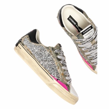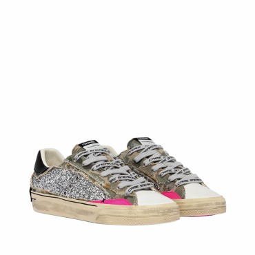Queste sneakers combinano una tomaia in glitter colore canna di fucile con raffinati dettagli in suede fuxia, creando un contrasto luminoso e dinamico. La linguetta in canvas camouflage con label logata in tessuto aggiunge un tocco grintoso e di tendenza, mentre il talloncino in pelle nera e la patch in pelle nera sul retro completano il design con eleganza.