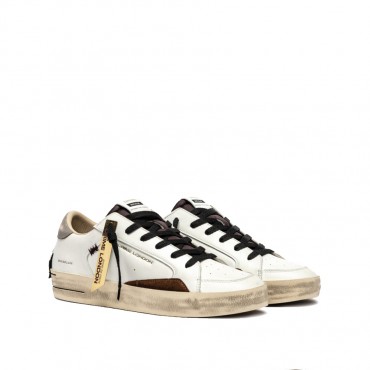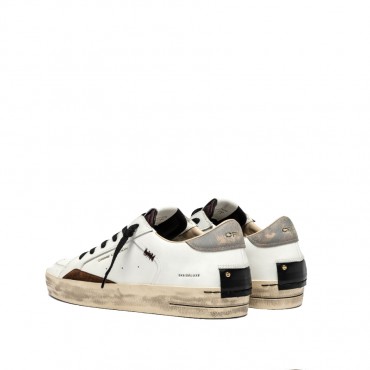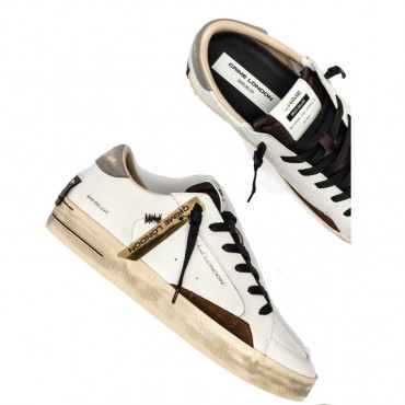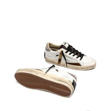 Sneaker realizzata con materiali di alta qualità Made in Italy Tomaia in pelle bianca con tallone a contrasto e dettagli in suede. Tomaia in pelle bianca, dettagli in suede marrone Talloncino in pelle grigia Linguetta in tessuto bordeaux con label logata in pelle Patch in pelle nera sul retro Lacci neri in poliestere Unico tag specchiato oro Fodera in pelle e tessuto Suola in ecopelle fasciata ivory, fondo miele scuro, alta 2.5 - 3.5 cm Effetto vintage