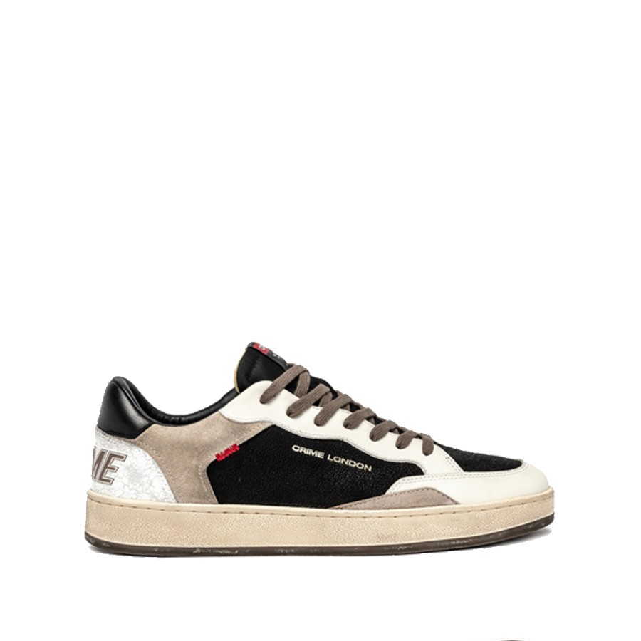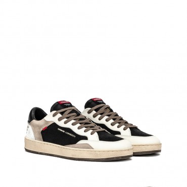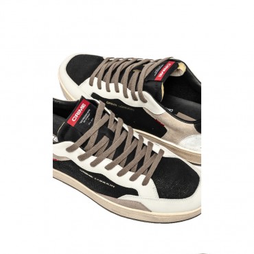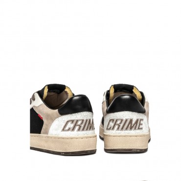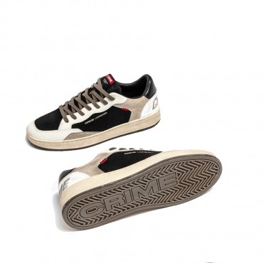 Sneaker realizzata con materiali di alta qualità Made in Italy Tomaia in nabuck nero, dettagli in pelle bianca Talloncino in pelle nero Tallone in cracklé bianco con logo CRIME Inserto in suede tortora Linguetta in tessuto nero con label logata in tessuto Lacci tortorain cotone Doppio laccio nero Fodera in pelle e tessuto Suola in gomma beige, fondo nocciola, alta 2.5 - 3 cm Effetto vintage