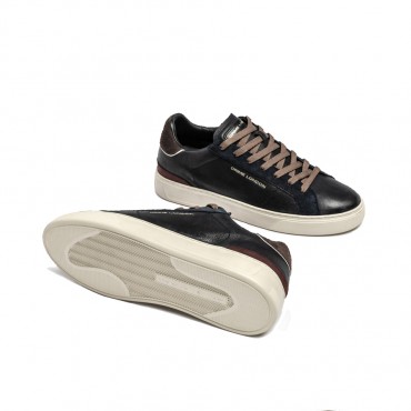 Sneaker realizzata con materiali di alta qualità Made in Italy Tomaia in pelle blu rogale , tallone in camoscio moro e dettagli in pelle bordeaux. Linguetta con label in pelle logata e testo stampato Patch in pelle Lacci beige