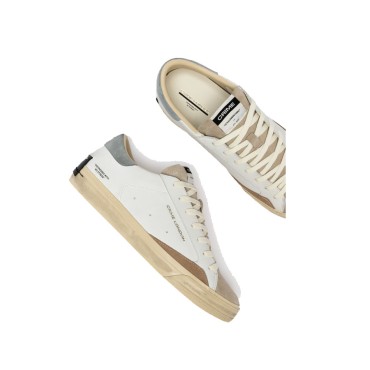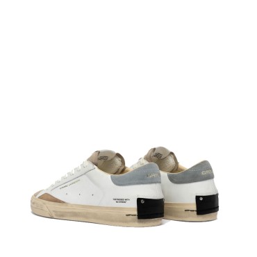 Sneaker realizzata con materiali di alta qualità Made in Italy Tomaia in pelle bianca, dettagli in suede marrone Talloncino in suede grigio Linguetta in suede taupe con label logata in tessuto Patch in pelle nera sul retro Lacci panna in cotone Fodera in pelle e tessuto Suola in ecopelle fasciata beige, alta 2.5 - 3 cm, fondo nero Effetto vintage