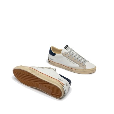 Sneaker realizzata con materiali di alta qualità Made in Italy Tomaia in pelle bianca, dettagli in suede grigio chiaro Talloncino in pelle blu scuro Linguetta in pelle bianca con label logata in tessuto Patch in pelle bianca sul retro Lacci grigi in cotone Fodera in pelle e tessuto Suola in ecopelle fasciata beige, alta 2.5 - 3 cm, fondo miele Effetto vintage
