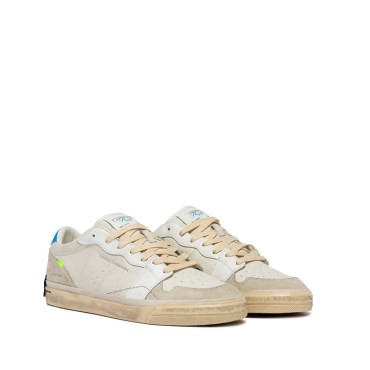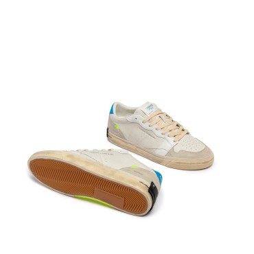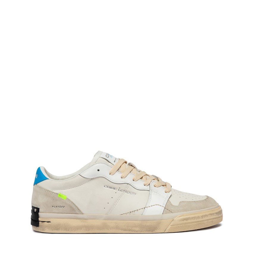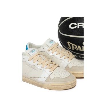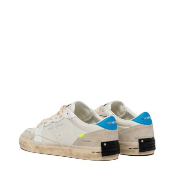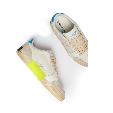 Sneaker realizzata con materiali di alta qualità Made in Italy Tomaia in nabuK e pelle White, dettagli in pelle bianca Talloncino in pelle celeste Tallone in nabuck bianco con logo CRIME Inserto gomma giallo fluo Linguetta in pelle bianco con label logata in tessuto Lacci bianco in cotone. Fodera in pelle e tessuto Suola in gomma beige, fondo bianco, alta 2.5 - 3 cm Effetto vintage