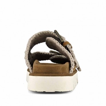Modello sandalo da donna scalzato. Novità per l'estate 2025: il low bio sandal two buckles è realizzato a mano in vera pelle scamosciata colore marrone cognac (COG) con le originali cuciture all'uncinetto distintive di mou, leggerissima suola in EVA di supporto e plantare imbottito in microsuede per un comfort ancora maggiore.