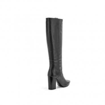 Modello stivale donna su tacco a tubo in pelle colore nero. Altezza generosa al ginocchio e forma a punta. Passepartout perfetto per un we fuori porta da abbinare la mattina a panta skinny e la sera a minidress.