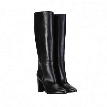 Modello stivale donna in pelle tinta unita colore nero. A fusto con mezza zip per una piu semplice calzata.  Ideale per un ampio utilizzo; sia per un quotidiano raffinato che per occasioni eleganti in un freddo inverno. Perfetto sotto gonne e longhette eleganti, non disdegna l'uso sotto maxy pool.  Su tacco in cuoio 10cm