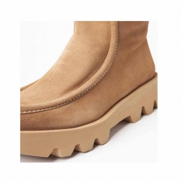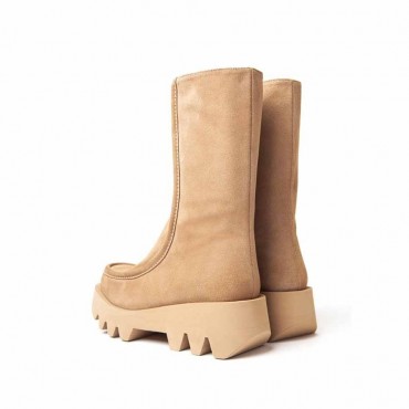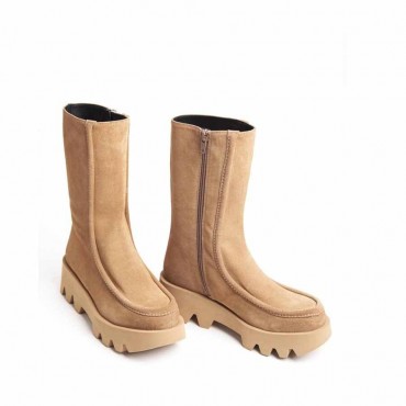 Modello stivale Ivet suede a 3/4 da donna in pelle scamosciata colore nocciola. Calzata facilitata dal zip sul lato interno. Altezza fusto 23 cm. Forma tonda e giardolo paraboot. Fondo roccia dal distintivo disegno in EVA: altezza tacco cm 5,5 plat anteriore cm 3. Utilizzabile non solo sotto pantaloni ma anche sotto vestiti e gonnelloni a sdrammatizzare un look romantico.