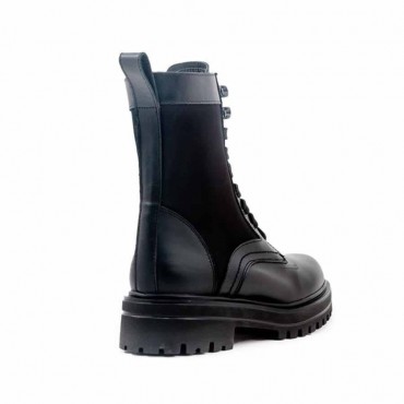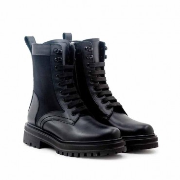 Modello anfibio donna in pelle colore nero con inserto in tessuto in tinta colore nero. Su fondo gomma carro armato ultra light. Il tronchetto dalla linea sobria puo essere utilizzato nel quotidiano sotto pantaloni, ma anche sotto leggins o abito e pantacollant per un look informale e ricercato. Il fondo 5 cm cucito vulcanizzato e gambale 23 cm. Design esclusivo e produzione Made in Italy